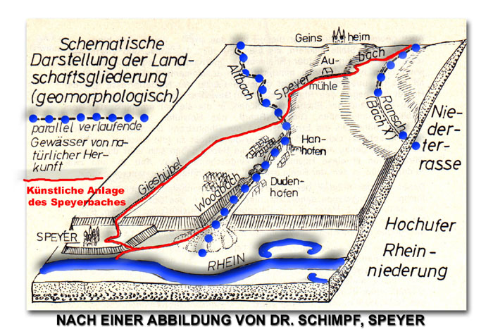 Der Speyerbach hat eine höchst ungewöhnliche Geschichte. Fast sein gesamter Lauf ist stark durch den Menschen geprägt, und zwar nicht erst seit der Neuzeit durch Begradigung, sondern schon seit mindestens 1000 Jahren, höchstwahrscheinlich allerdings sogar schon seit der Römerzeit. Der „Speyerbach" (er heißt vor Speyer „Gießhübel", in Speyer ,, Stadtbach", heute ist er auf den topografischen Karten allerdings durchweg als Speyerbach eingetragen) ist eines der Rätsel der Geschichte dieser Region. Schriftliche Zeugnisse über seine Existenz reichen zwar bis ins Mittelalter zurück, seine Entstehung jedoch liegt im Dunkel der Frühgeschichte. Der Bach ist zweifach künstlich geteilt, nämlich beim Winzinger Wassergescheid in Neustadt, wo der Rehbach abgezweigt wird (1/3 des Wassers fliesst hier nach Nordosten ab) und beim Hanhofer Wassergescheid, wo der Bach in Woogbach (2/3 des Wassers) und Speyerbach (1/3 des Wassers) geteilt wird. Beide fliessen kurz vor der Mündung in den Rhein allerdings wieder beim Holzmarkt im Altstadtbereich von Speyer zusammen. Man muss hier allerdings deutlich differenzieren: Der Lauf des Baches ist bis mindestens Neustadt/Weinstrasse im gesamten Bereich des Pfälzerwaldes als prinzipiell natürlich anzusehen, der gesamte Verlauf im Bereich der Rheinebene ist wohl mehr oder weniger artifiziell. wenn im weiteren über Theorien seiner Entstehung geschrieben wird, dann bezieht sich das ausschliesslich auf den Lauf des Baches auf den letzten 20 Kilometern, ca. ab der Höhe von Geinsheim. Theorien zur Entstehung des SpeyerbachesSoweit die Zeugnisse zurückreichen, hat man den Speyerbach immer als künstlich empfunden. In der Diskussion über seine Entstehung zeichnen sich im wesentlichen drei Theorien ab. Theorie 1Bau durch die RömerSchon Christoph Lehmann führt in seiner „Chronika der freien Reichsstadt Speyer" (1652),,die" Bach auf die Kunstfertigkeit der Römer zurück: Die „Teutschen" (d. h. die Germanen), so begründet er seine Ansicht, hätten „sich mit solcher Bemühung zu beladen und mit großer Arbeit solche Wasserleitung anzustellen / für eine Unehre und ihrer Freiheit verkleinerlich ermessen / wie sie dann vom Ackerbau und allerhand Arbeit ein Scheuens (Abscheu) gehabt . . . Die Römer aber haben zu solchen nützlichen Wasserleitungen sondere Lust und Neigung gehabt / und der Bach aussin Gebirge einen Graben und Gang auf und durch die Stadt geführet". Zu den Vertretern dieser Theorie gehören auch C. Weiss, der den Rehbach für das eigentliche Bett des Speyerbaches hält , und J. Weber, der jedoch die Möglichkeit offenläßt, daß auch die Franken den Bach abgeleitet haben könnten. Theorie 2Bau durch die FrankenHiermit ist bereits die zweite Theorie angedeutet; ihre Verfechter neigen zu der Ansicht, die Franken hätten den Kanal gebaut. Dieser germanische Volksstamm besetzte, von Norden kommend, unser Gebiet im 6. Jhdt. n. Chr. Die Alemannen, die es seil dem Abzug der Römer (Anfang 5. Jhdt.) besiedelt halten, wurden nach Süden verdrängt. In der Nähe der von den landnehmenden Germanen zerstörten römischen Stadt Civitas Nemetum gründeten die Franken ein Dorf, dem sie den Namen „Spira" gaben. Der Name soll von dem Bach stammen, an dessen Mündung in den Rhein das Dorf lag (etwa im Gelände des heutigen Bahnhofs, der Rhein floß damals in einer Schleife am Hochufer entlang, unterhalb der heutigen Bernharduskirche also). Das Wort wäre, nach dieser Theorie, gebildet aus ahd. spiwan = speien (auch als spiran zwar nicht belegt, aber aus mhd. spiren zu erschließen) und dem uralten Namenssuffix -aha =(fließendes) Wasser, urverwandt mit lat. aqua == Wasser. „Spiraha" hieße also „heraussprudelndes, herausgespieenes Wasser", wobei die Quelle, also dem Flüßchen den Namen gegeben hätte. Wie zahlreiche andere uralte Siedlungsnamen, wie etwa Fulda, Bebra, wäre Spiraha - Spira - Spire - Speir - Speier demnach einer der sog. Gewässernamen, wie sie in der Zeit vor der Landnahme der Völkerwanderung von den Germanen mit Vorliebe verwendet wurden (von diesem Dorf „Altspeier" ging dann der Name auf die aus den Ruinen der Römerstadt wieder aufblühende Siedlung „Neuspeyer" über). Es lag natürlich nahe, von dem Namen des Dorfes aus weitere Schlüsse zu ziehen auf den Bach: Wenn er dem Dorf den Namen gegeben hat, muß er mindestens so alt sein wie dieses selbst. So hat, wohl als erster, der badische Geschichtsforscher Fr. J. Mone die Franken zu Bauherren des Speyerbaches erklärt. Er datierte den Bau in die 2. Hälfe des 9. Jahrhunderts. Diese Ansicht wurde schon bald von dem bedeutenden Speyerer Germanisten und Keltisten C. Zeuss verbessert. Dieser konnte sich auf den sog. Geografen von Ravenna berufen, der in einer Art geographischem Handbuch den Namen Spira, zusammen mit anderen Städten am Oberrhein, erstmalig erwähnt. Er hätte, so glaubte man damals, dieses Handbuch unter Karl dem Großen aus verschiedenen älteren Schriften zusammengetragen, jene Stelle mit dem Ortsnamen Spira sollte aus einem Werk eines gotischen Schriftstellers Alhanarid stammen, der im 6. Jhdt., gelebt hätte, also ein Zeitgenosse unserer Franken gewesen wäre. Die Forschung hat inzwischen diese Angaben im einzelnen revidiert: Der Ravennate lebte nach heutiger Ansicht nicht im 8. sondern im 7. Jhdt. Der Gewährsmann Alhanarid ist nicht nachzuweisen und vermutlich erfunden. Doch gilt als ziemlich sicher, daß der Geograph eine Karte aus dem 5. bis 6. Jhdt. als Quelle für seine Schrift verwendet hat (nach: Paulys Realenzyklopädie der klass. Altertumswissenschaften I I/I 1920, S. 305 ff). Auch die Zeuß’sche Deutung des Namens vom „spirbaum" (Speierbaum) her, zu der ihn die Schreibung sphira veranlaßte, kann als überholt angesehen werden. Doch bleibt sein Nachweis des fränkischen Dorfes für das 6. Jhdt. gültig und ist auch heute noch der Angelpunkt der Herleitung und Entstehungsgeschichte der Stadt Speyer, zumal man , neuerdings eine schriftlich