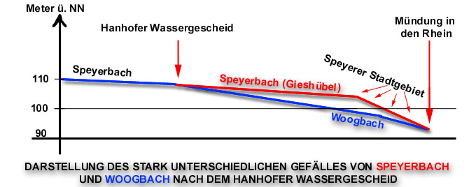 Nicht so einfach war das Problem beim nächsten „Querbach" zu lösen, dem Hainbach. Er lag zu tief, daher konnte er nicht in den Kanal geleitet werden. So führte man ihn kurz vor Dudenhofen in der „Zwölfmannsdole" unter dem Speyerbach hindurch (der Name deutet auf die zwölf Erbpächter des nahegelegenen Maulbronner Klosterhofes: sie mußten die Dole instandhalten) - (nach Ph.Fauth, Hydrographisches vom Speyerbache, Pfälzische Heimatkunde, 1905). Als „Krebsbächel" durcheilt er Dudenhofen und mündet auf dem schnellsten Weg in den Woogbach. Das sind wertvolle Hinweise, doch lösen sie noch nicht „das hydrographische Rätsel des Speyerbaches", wie Ph. Fauth meinte. Hierzu kann die genaue Beobachtung einiger einfacher Gesetzmäßigkeiten beitragen, wie sie jedes Gewässer hat: etwa, daß es fließen, d. h. Gefälle haben muß; Wasser fließt nicht bergauf und nicht über Berg und Tal. Und es hinterläßt Spuren seiner Arbeit, seines Fließens, im Gelände. Im Gelände kann man eine Reihe von „Gesetzwidrigkeiten" festgestellt werden, und gerade aus ihnen läßt sich nicht nur mit Sicherheit auf die Künstlichkeit großer Teile des Bachsystems schließen, sondern auch auf einige genauere Einzelheiten der Entstehung, die man bisher nicht kannte oder nur vermutete. Wenn man die Gefällekurven der beiden Bäche vergleicht, so fällt auf, daß der Bach vor der Gabelung mit normalem Gefälle ankommt, nach der Trennung aber der „Woogbach" geradezu absackt, während der „Speyerbach" in gleichmäßig sanftem Gefalle zum „Gießhübel" geleitet ist, vom Stadtrand, dem Hochufer ab allerdings in steilem Fall den Höhenunterschied bis zum Rhein sozusagen nachholt (8m auf 2km!).