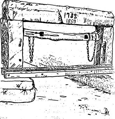 1859 auf dem Querbalken. Massiver Bundsandsteinbau mit Vorrichtung zum