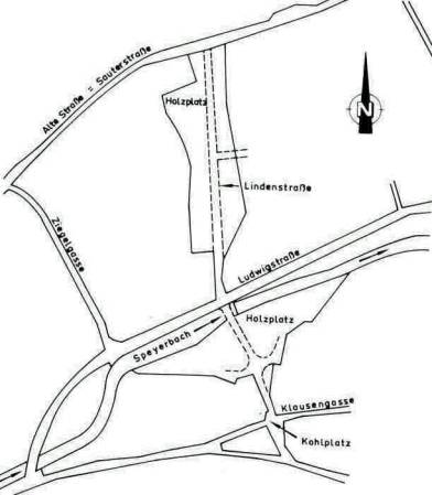 der rechten Seite des Speyerbachs zwischen der heutigen Wolfsburgstraße und dem