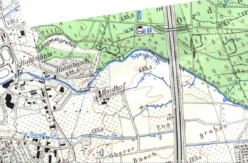 HEUTE: Landschaft ausgeräumt, eine dicke A 65 zieht durch die Wiesen. Quelle der Karte: TK25 des Landesvermessungsamtes Rheinland-Pfalz von 1996, 6615 Haßloch