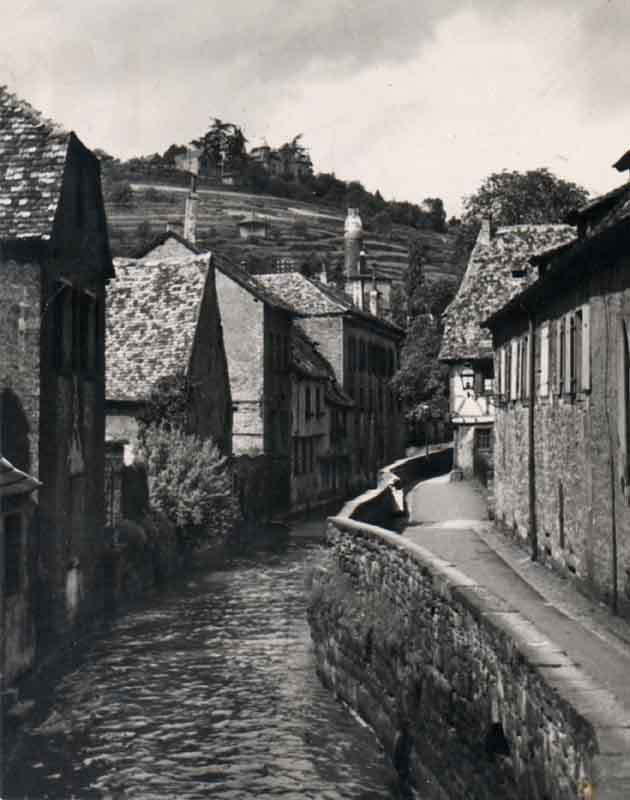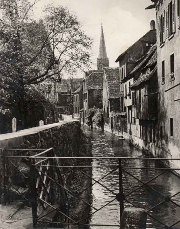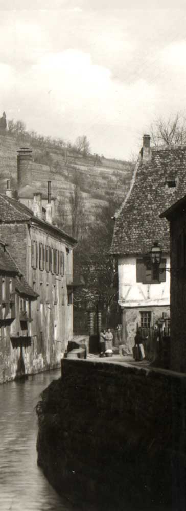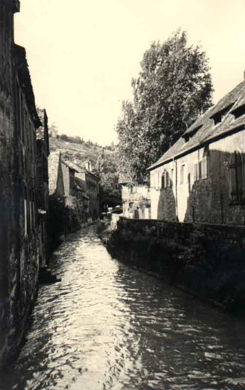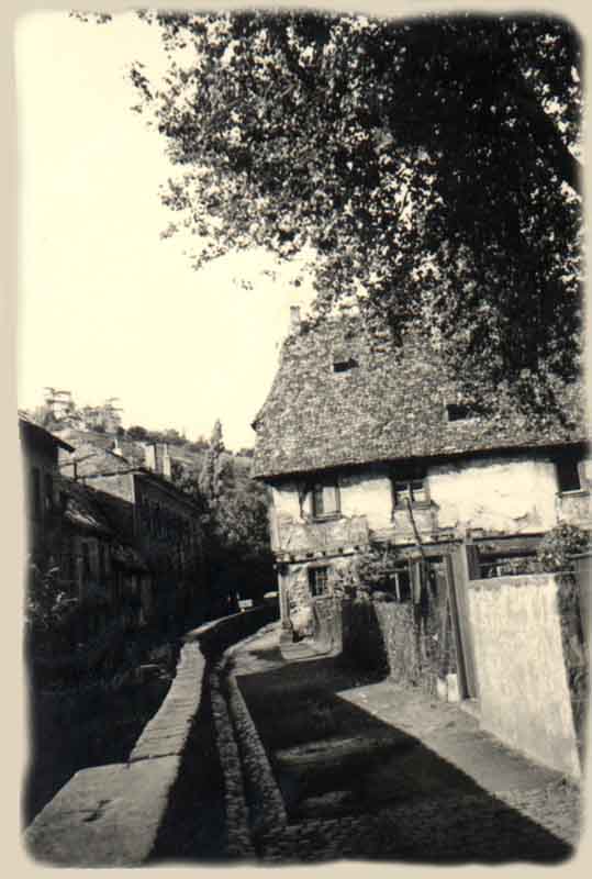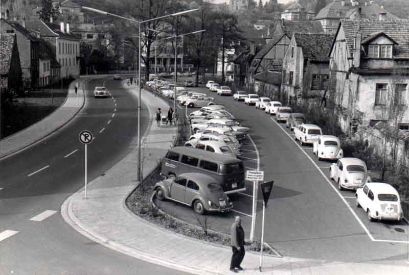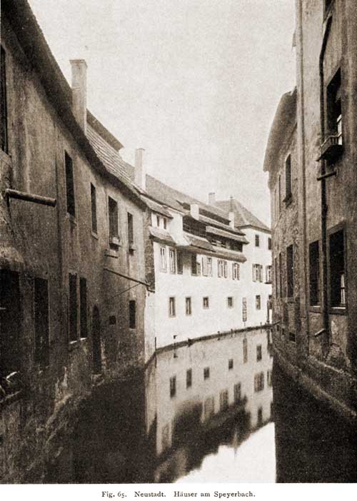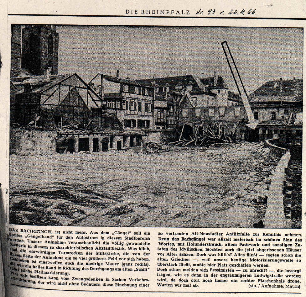 Das Bachgängel in Neustadt/Weinstraße (Bildquelle: Stadtarchiv Neustadt, wenn nicht anders vermerkt) Der alte Weg am Bach entlang, kurz Bachgängel genannt, war aus heutiger Sicht ein optisches Filetstück und Romantik pur. Durch den Torbogen des Gasthauses "Zum Schiff" konnte man von der Rathausstraße auf einem Fußweg längs des alten Bachbettes vorbei am früheren Schulhaus zur Rittergartenstraße gelangen. Der Weg war weit höher als die damalige Wasseroberfläche. Häuserfront, Giebel, und die kleinen Zugänge zum Bachbett boten einen äußerst malerischen Anblick. Infolge der Zunahme des Verkehrsaufkommens wurde im Jahre 1953 der Durchbruch am Bachgängel eingehend erörtert. Dennoch vergingen über 10 Jahre, bis das Projekt verwirklicht werden konnte. 1965 waren alle Hindernisse ausgeräumt; die Arbeiten begannen am 2. August 1965, eine lang andauernde Baumaßnahme war nach Jahrzehnten der Diskussion angelaufen. Es ging darum, den Verkehr von der Maximilianstraße über den Strohmarkt direkt in die Ludwigstraße zu. leiten. Zahlreiche alte Häuser fielen der Spitzhacke zum Opfer, darunter auch das Gasthaus "Zum Schiff' (1966). Für den Floßbach wurde unter der neuen Straße eine Art Tunnel geschaffen. Damit war, von wenigen Quadratmetern abgesehen, das alte Bachbett nicht mehr nötig und konnte im Zuge der Baumaßnahme eingeebnet werden. Seitdem hat der Floßbach zwischen Rathausund Rittergartenstraße einen anderen Verlauf. Im März 1967 konnte die Asphaltdecke aufgebracht werden. Eine neue Straßentrasse war entstanden und die heutige B39 hat den alten Bachverlauf übernommen.