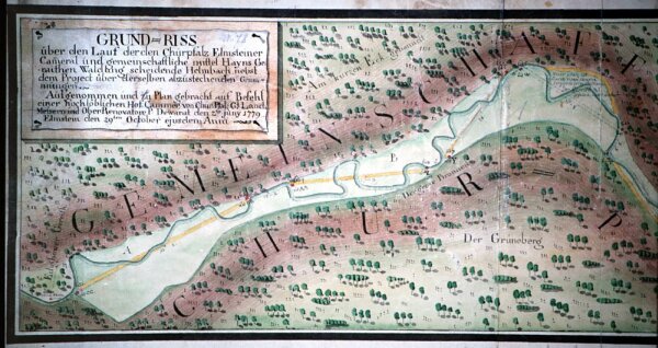 Die Originalkarte von 1779, auf die Karte klicken um weiterzuschalten. Norden und Süden sind gegenüber heutigen Karten invertiert. Quelle der Karte: LASP WW1/Nr.78/1-3, digital bearbeitet von M.Grund,