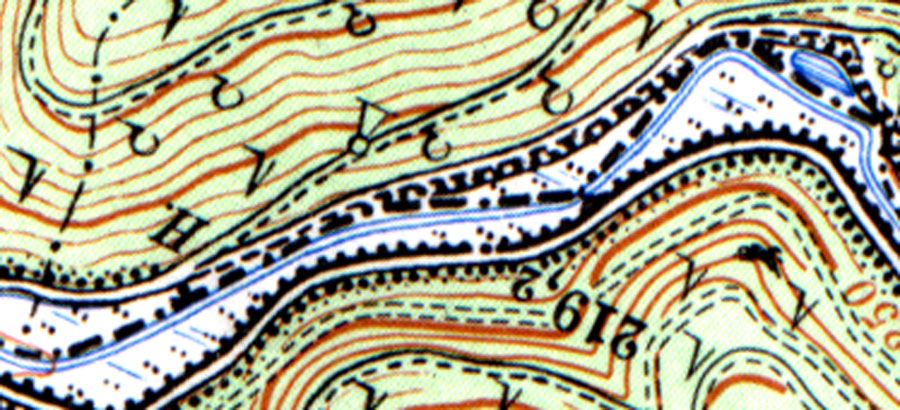 Hellblau der heutige Bachverlauf nach der TK25, auf die Karte klicken um weiterzuschalten, Quelle der Karte: LASP WW1/Nr.78/1-3, digital bearbeitet von M.Grund Ein Ausschnitt aus der aktuellen topografischen Karte, gleicher Ausschnitt und Maßstab wie oben, Quelle: TK25 des Landesvermessungsamtes Rheinland-Pfalz von 1996, Blatt 6613 Elmstein