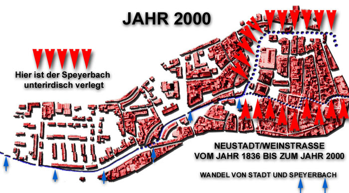 Anhand dieser Karte wird exemplarisch gezeigt, wie dramatisch der Bach aus dem Stadtbild verschwunden ist. Digitale Bearbeitung der Karte vom Autor.