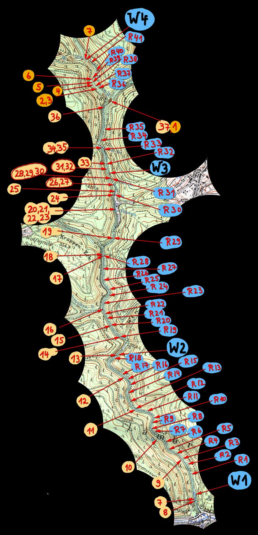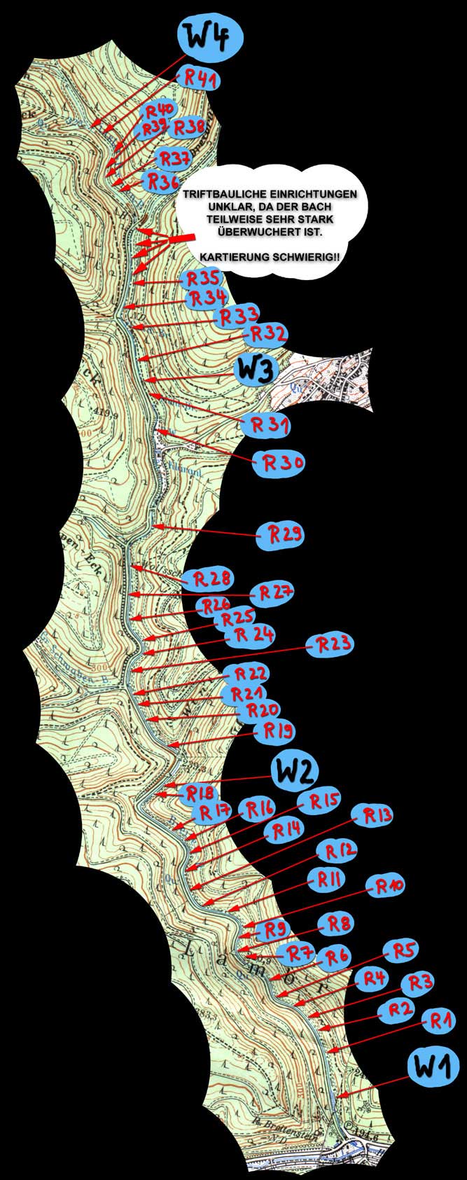 Übersicht der Triftbaueinrichtungen des Breitenbaches vom Quellbereich im Finster- Breitenbachtal bis Breitenstein Bei der Kartierung der triftbaulichen Einrichtungen konnte ich im Sommer 2000 folgende Bauten identifizieren: - 4 Wooge unterschiedlicher Grösse (einschliesslich des Speyerbrunner Quellwooges des Speyerbaches) - Mindestens 41(!) Riesel, die zwischen geschätzten 0,5 und 3,0 Meter hoch sind