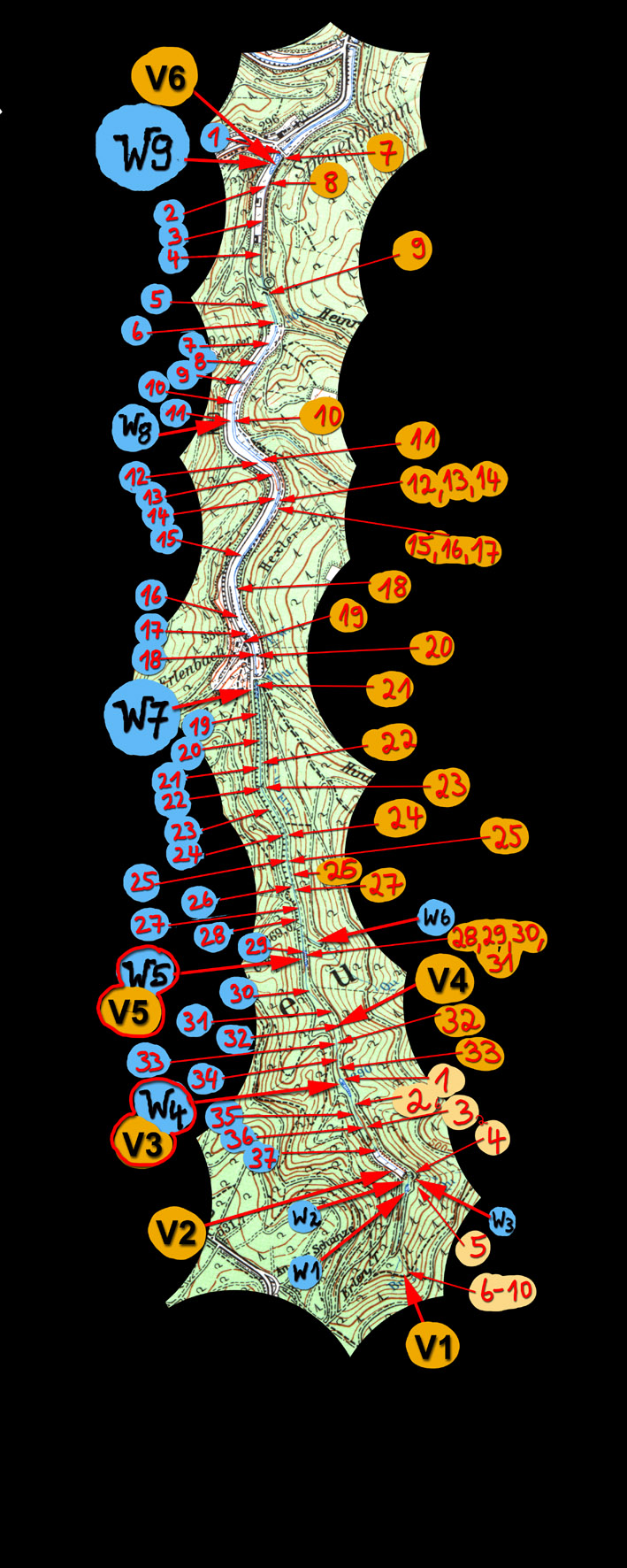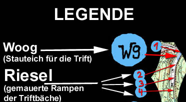Übersicht der Triftbaueinrichtungen des Erlenbaches vom Quellbereich bis einschliesslich Speyerbrunn Bei der Kartierung konnte ich im Sommer 2000 folgende Bauten identifizieren: - 9 Wooge unterschiedlicher Grösse (einschliesslich des Speyerbrunner Quellwooges des Speyerbaches) - Mindestens 37 (!) Riesel, deren Fallhöhe zwischen geschätzten 0,5 Meter und 4,0 Meter betragen dürfte