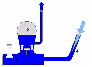 enthaltene Luft wird verdichtet und die Wassersäule im Steigrohr (3)